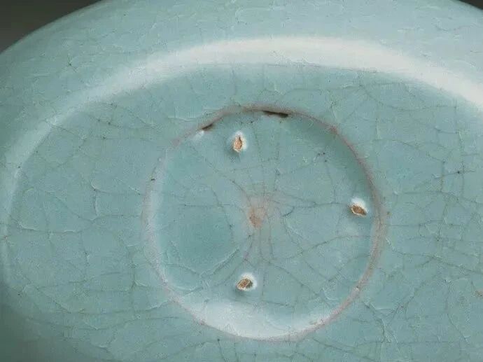 汝窑平件支钉断痕形似芝麻形,较小的和温度低的器物钉痕小,较大的和温度高的器物钉痕大。