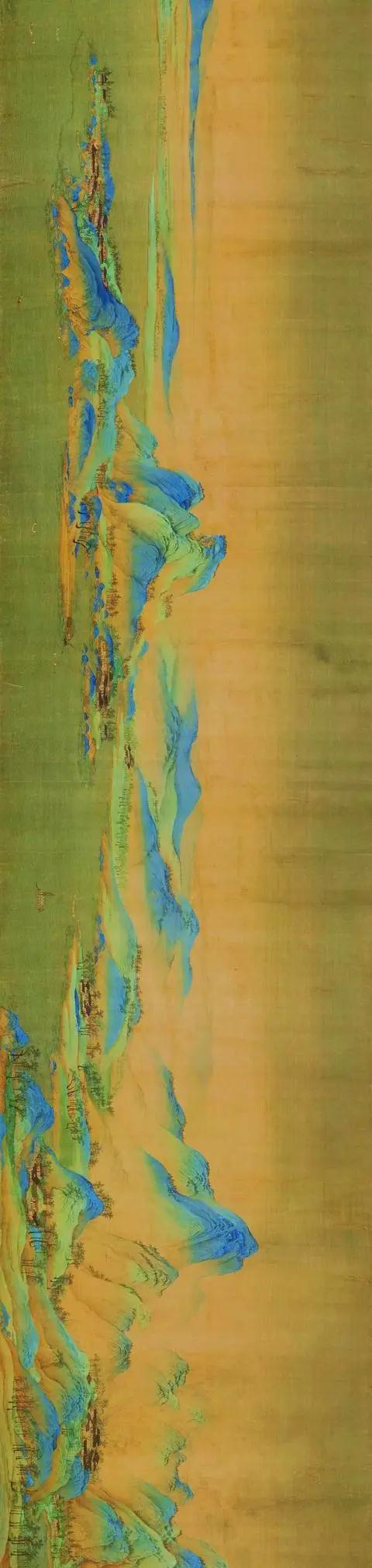 画面上峰峦起伏绵延,江河烟波浩淼,气象万千,壮丽恢弘。山间高崖飞瀑,曲径通幽,房舍屋宇点缀其间,绿柳红花,长松修竹,景色秀丽。山水间野渡渔村、水榭楼台、茅屋草舍、水磨长桥各依地势、环境而设,与山川湖泊相辉映。