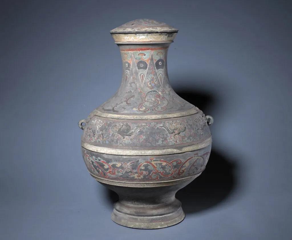 凸雕龙凤纹彩绘陶壶,西汉,通高64厘米,口径21厘米,足径24厘米。